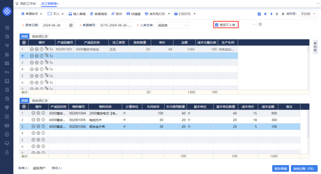 第一步:完工驗收單表頭勾選“廢品不入庫”。