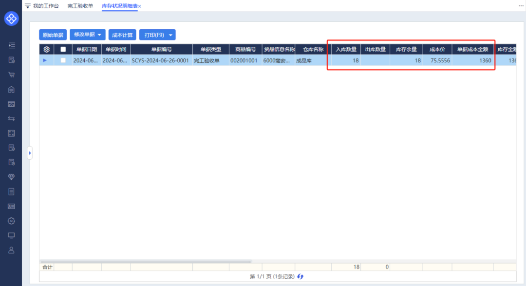 軟件在過賬的時候會將“充電寶”按數量18進行入庫,入庫的成本金額為1360。