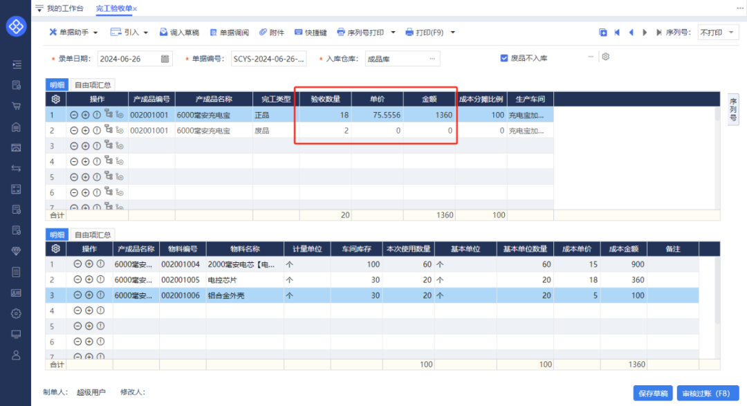 第二步:對產成品進行拆行,然后將“完工類型”調整為“廢品”,并錄入正品、廢品各自的數量。