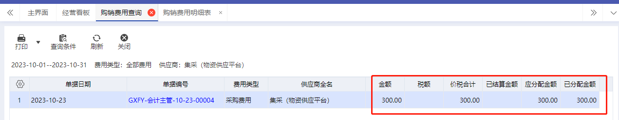 在費用管理—購銷費用查詢中可以查看一段時間內發生的各種費用明細、總額及其費用分配情況。