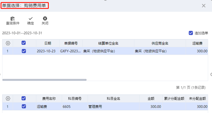 之后,在單據表體錄入采購發生的費用項目,如“運輸費”、“裝卸費”及費用金額,保存單據即可生成采購費用單。