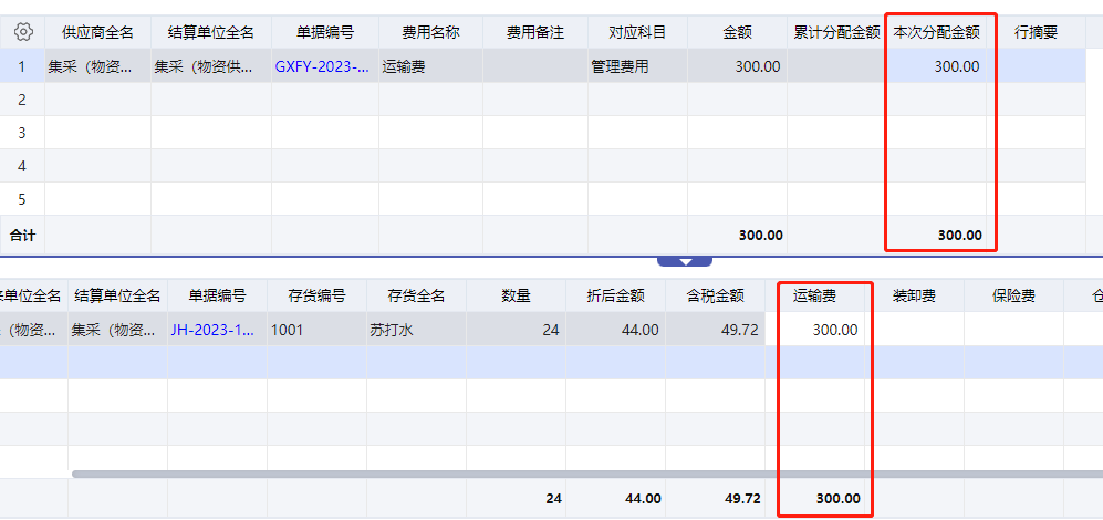 注:分攤可根據企業需要,選擇不同的分攤方式。管家婆財貿ERP可為企業用戶提供“按數量分攤”、“按折后金額分攤”、“按含稅金額分攤”3種模式來進行自動分攤。分攤費用上下表格合計必須相等。