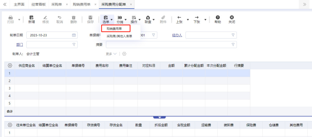 在業務處理—采購業務—采購費用分配單中,上表體選擇待分配的購銷費用單,下表體再選擇需要分配的采購單或其他入庫單,即可對采購費用進行分配。