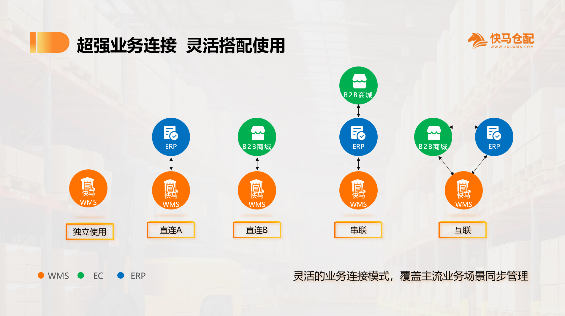 相比過去,新一代云WMS的出現,克服了傳統 WMS 的諸多應用壁壘,以快馬倉配WMS為例,采用標準化產品架構,企業無需硬件部署即可開通使用,SaaS 模式基礎功能模塊的月費支出較傳統模式降低 60 - 80%。同時,通過開放API接口與 ERP、電商平臺實現數據貫通,形成完整的數據鏈,其在多個方面展現出顯著優勢。
