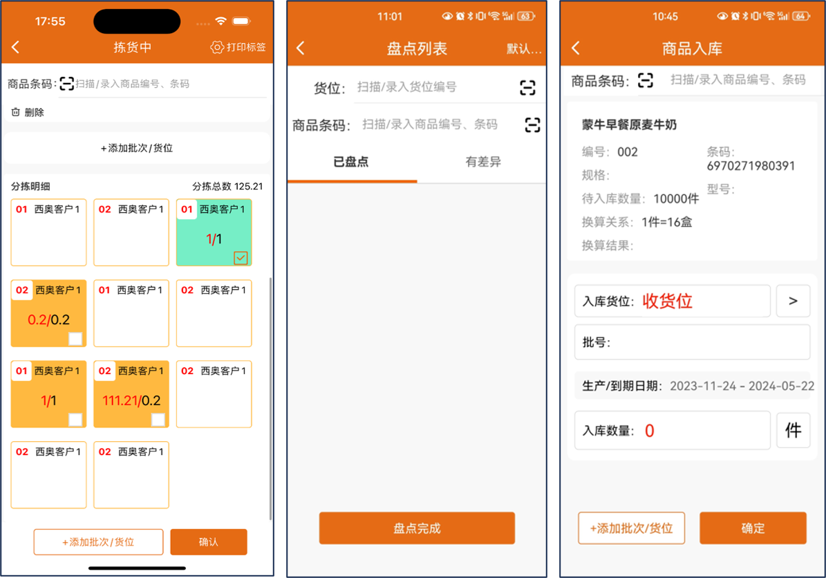 快馬倉配手機端模擬燈光揀貨、盤點、掃碼入庫局部截圖