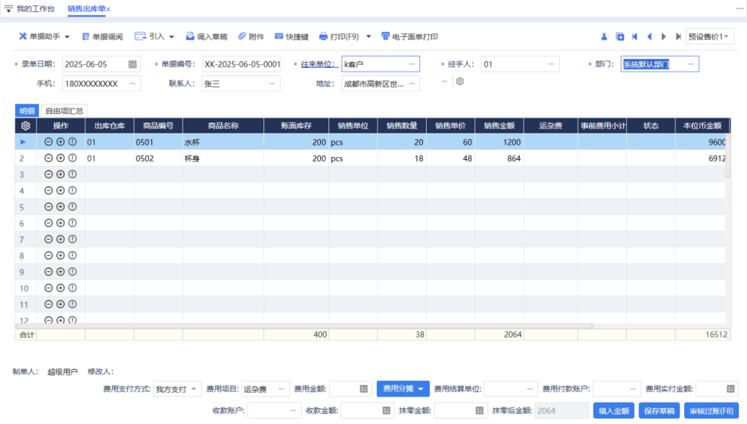 說明:如果客戶臨時更改地址,直接在單據中修改即可,該修改不會影響客戶檔案中保存的地址信息。
