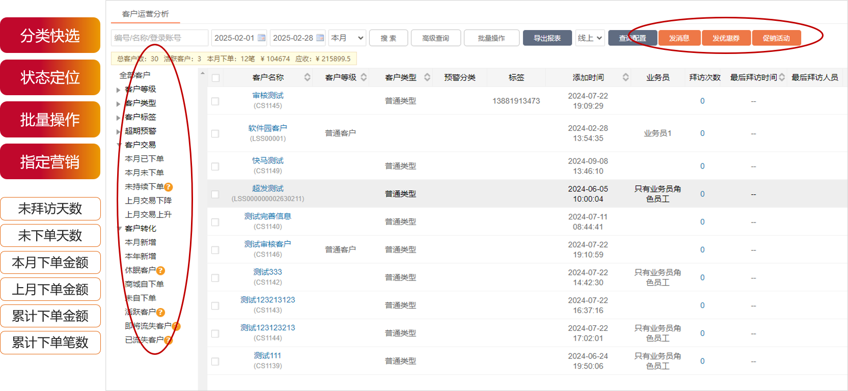 · 客戶分層運營:通過 “高潛力新客、沉睡老客、區(qū)域 TOP 客戶” 標(biāo)簽定向推送活動,某飲料經(jīng)銷商向 “未下單超 30 天” 客戶推送喚醒券,激活 30% 休眠客戶,月銷售額增長 18%。