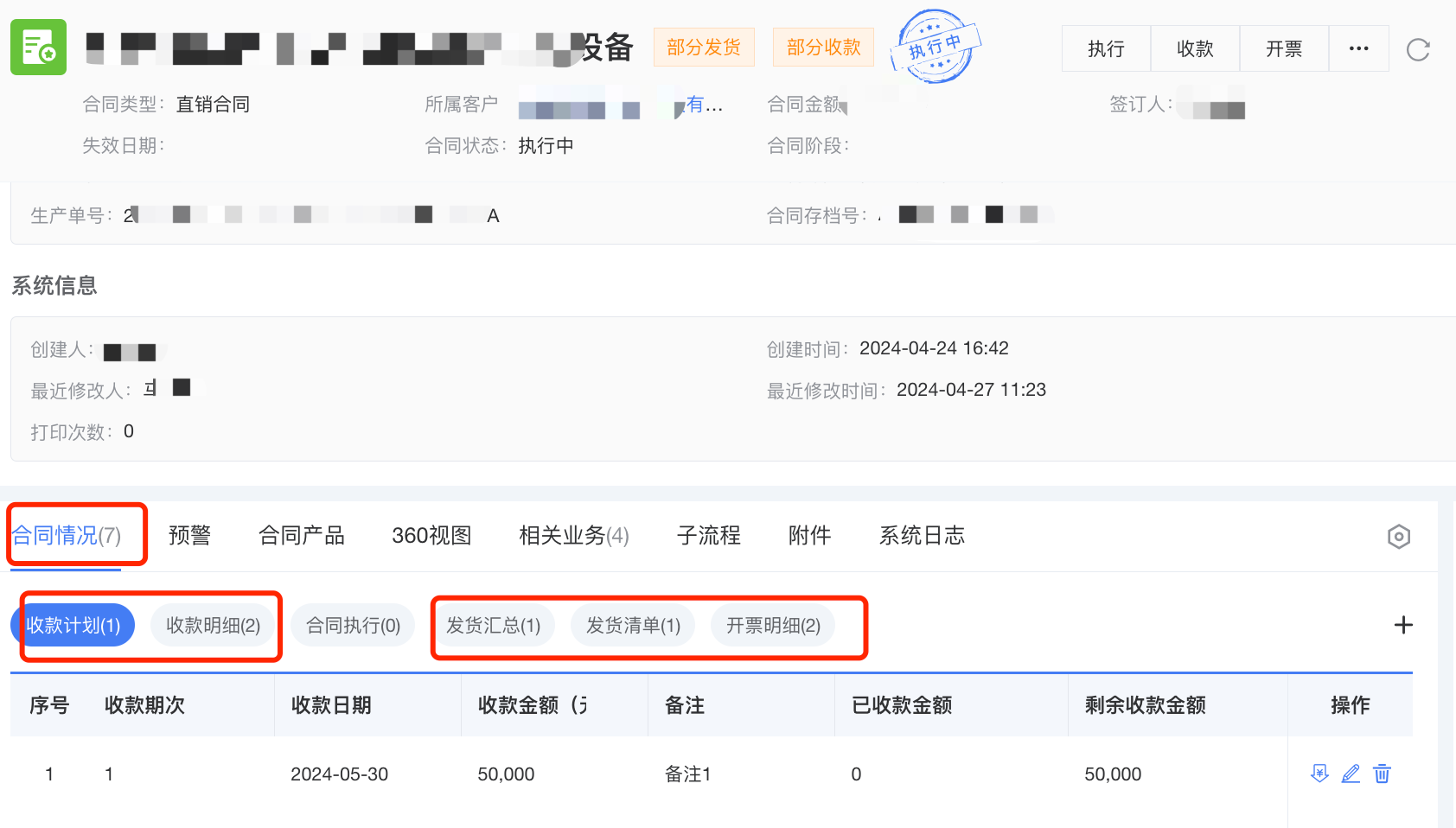 3、全面有效管理合同的收款和發貨,系統實時跟蹤和匯總合同執行情況,管理員通過360視圖,可以直觀看到匯總數據。