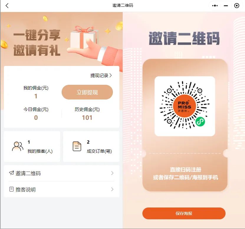 客戶可以通過分享專屬邀請碼實現(xiàn)拓客的需求,商城系統(tǒng)自動記錄推客人數(shù),并計算出提成,當完成上下級關系的綁定,在交易后自動進行分潤。