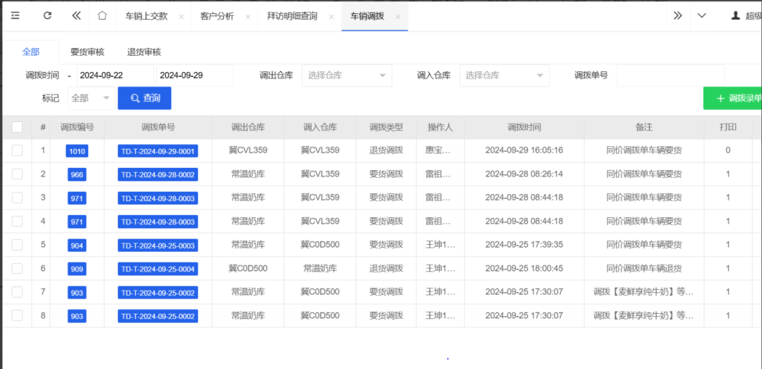 2、針對業務員車銷流程、業務員車輛要貨的需求,庫管進行調撥審核,并能查看和統計具體調撥的批次產品。