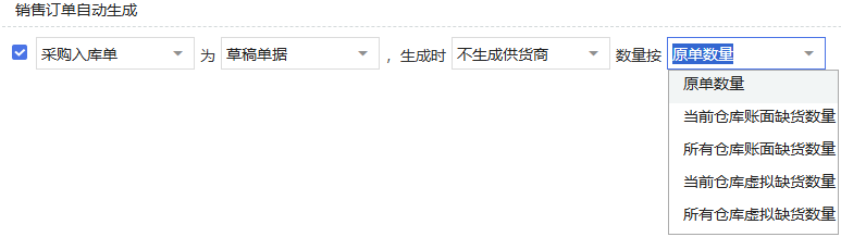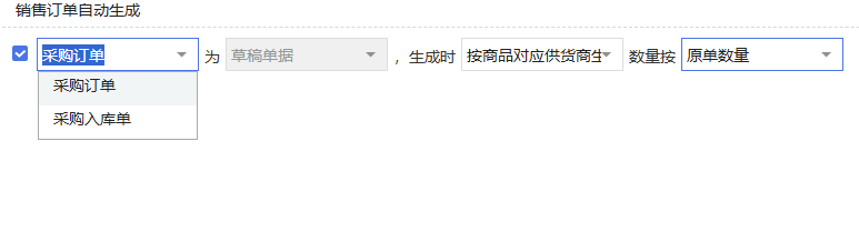啟用虛擬庫存,在“銷售單據(jù)配置”中銷售訂單自動(dòng)生成勾選生成采購(gòu)訂單或采購(gòu)入庫單。