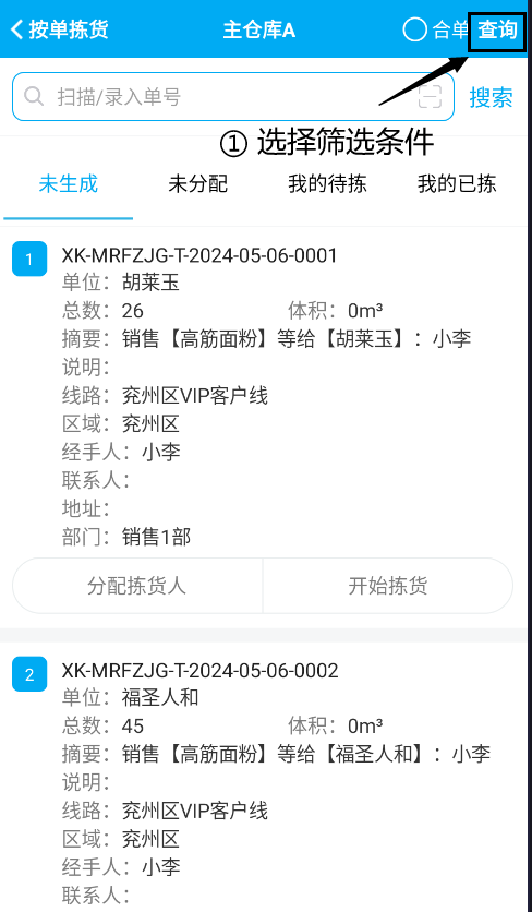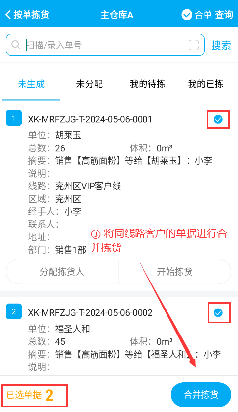 業務員前一天開的單據,流轉到WMS后臺,揀貨員會依據每條路線來進行單據合并,并且把每張合并的單據,按照庫區進行拆分,再由每個庫區對應的負責人進行揀貨,揀貨完成后,把貨集中在發貨區,這樣可以減少倉庫員工的走動范圍,也可以提高裝車效率。